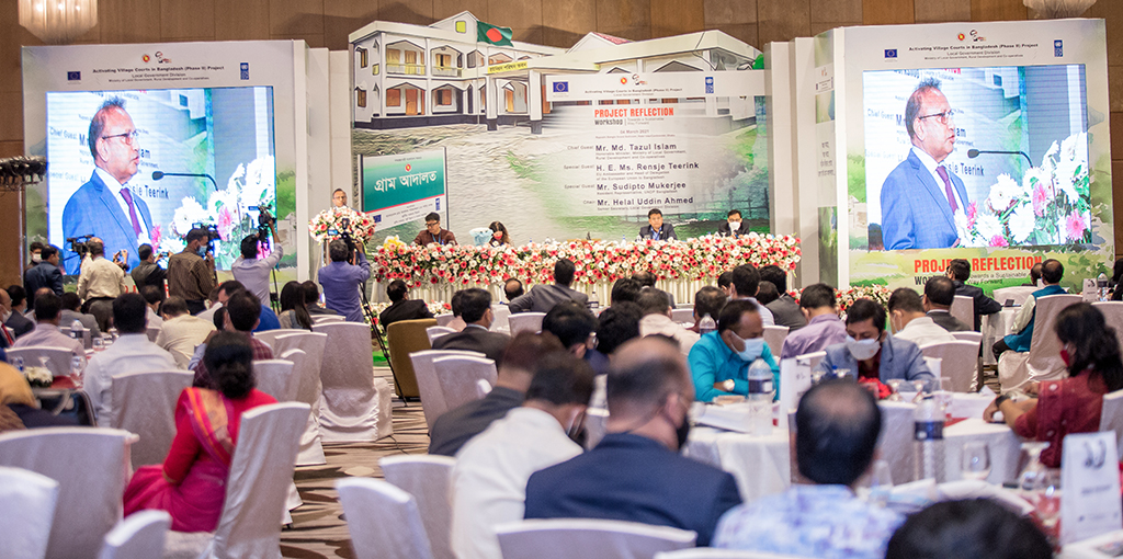 Dhaka, 04 March, 2021: “Activating Village Courts in Bangladesh phase II” project organized a Project Reflection workshop on 04 March 2021 at Hotel InterContinental Dhaka aiming to explore a sustainable way forward to ensure access to justice for rural and marginalized people of Bangladesh. Local Government Division (LGD) of the Ministry of LGRD and Cooperatives is implementing the project with technical and financial support from the Government of Bangladesh, European Union, and UNDP. The overall objective of the workshop is to contribute to ensuring the sustainability of the project through implementing an institutional monitoring system, ensuring effective engagement of Accounts Assistant cum Computer Operators (AACOs) to run village courts, and documenting the lessons learned for effective phasing out of the AVCB II project.