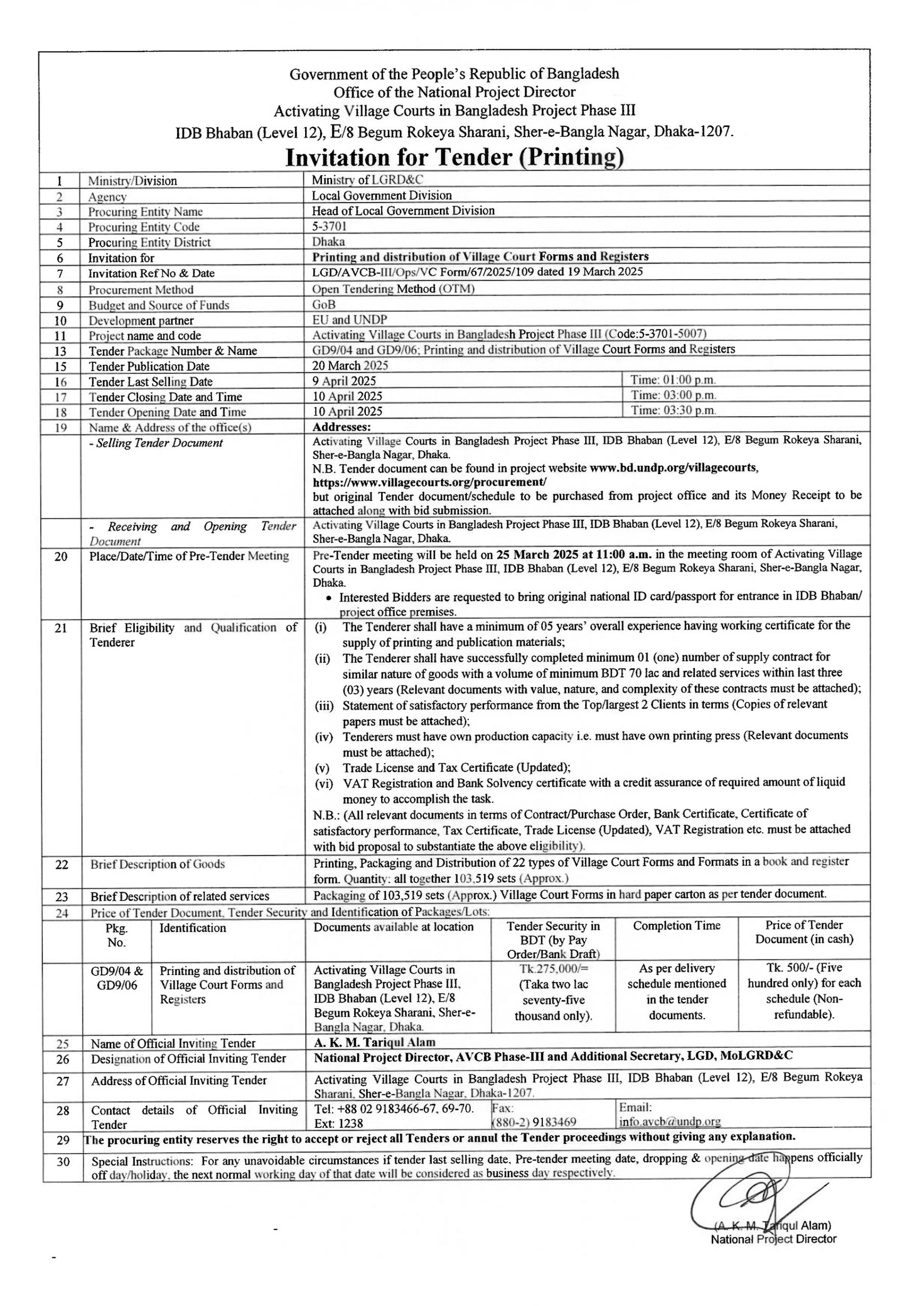 N.B.: Tender document can be found in project website www.bd.undp.org/villagecourts, https://archive2.villagecourts.org/procurement/ but original Tender document/schedule to be purchased from project office and its Money Receipt to be