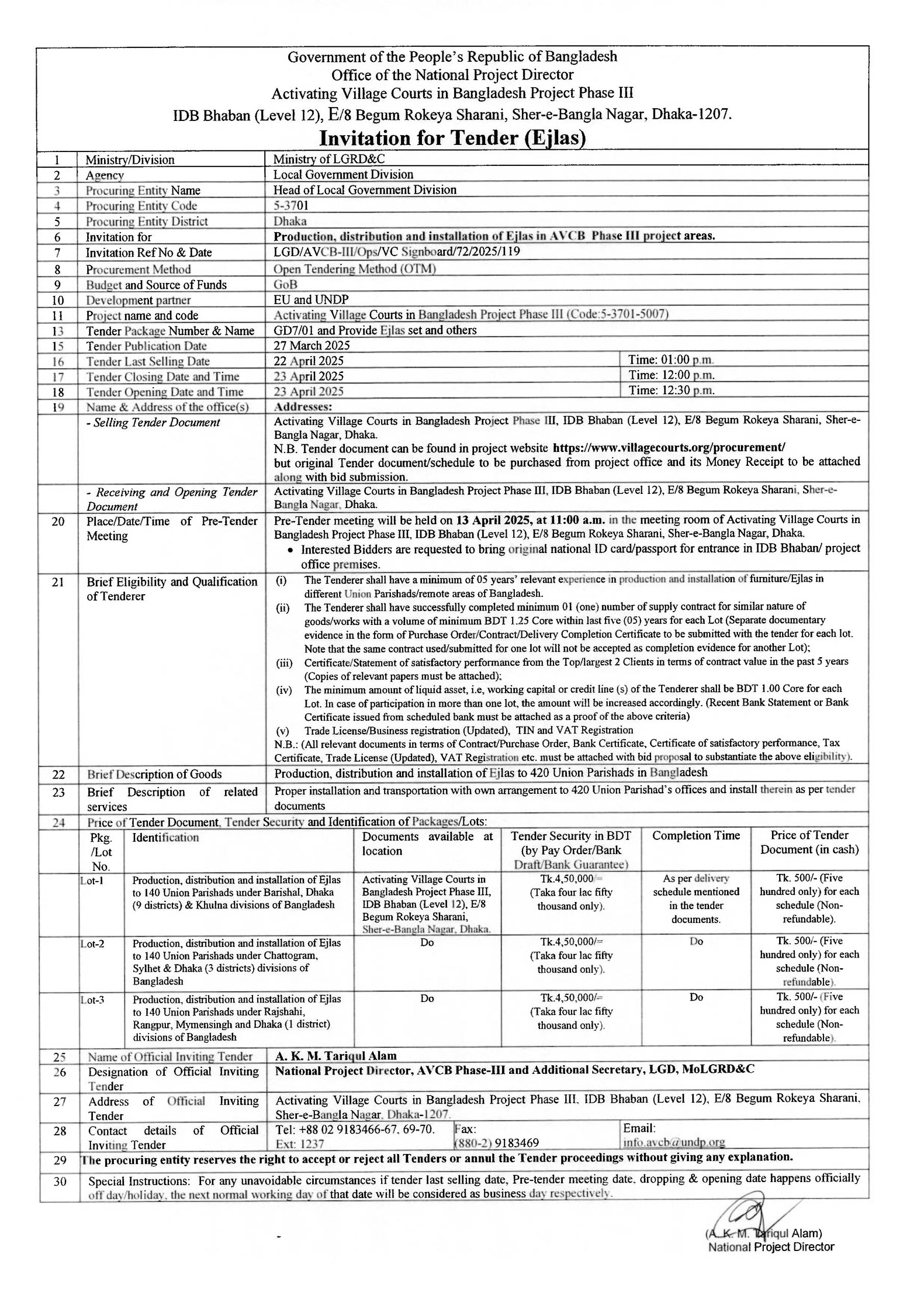 Tender Last Selling Date, Time, and Place: STD will be closed on 22 April 2025, at 01:00 p.m. at the office of Activating Village Courts in Bangladesh Phase III Project, IDB Bhaban (Level 12), E/8 Begum Rokeya Sharani, Sher-e-Bangla Nagar, Dhaka.
