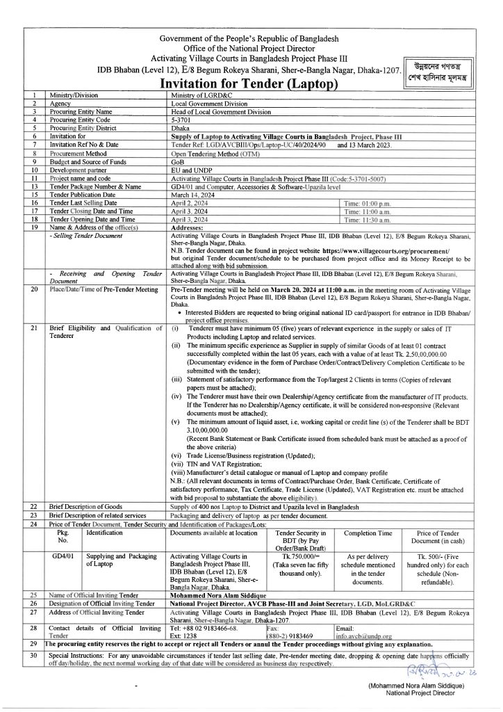 Supply of Laptop to Activating Village Courts in Bangladesh Project, Phase-III